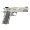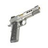 The RAPIDE (DAWN) in .45 ACP, a truly unique 1911 with stepped cocking serrations, slide lightening cuts for faster slide lock-up, and TiN coated barrel for extreme durability. Equipped with Kimber Stiplex front strap stippling and gray/black G10 Rapide patterned grips for extra griping confidence. Kimpro Silver finish with brush polished flats finish off the stunning looks.
