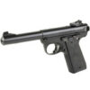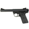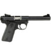 The Ruger Mark IV 22/45 has a simple, one-button takedown for quick and easy field-stripping and proper chamber-to-muzzle cleaning. Pressing a button in the back of the frame allows the barrel-receiver assembly to tilt up and off the grip frame without the use of tools. The pistols features a precision-molded polymer grip frame with a serrated front strap and checkered backstrap; Cold hammer-forged bull barrel; ergonomic bolt stop; checkered, 1911-style grip panels for non-slip hold; contoured ejection port and easy-to-grasp bolt ears; drilled and tapped receiver for Weaver or Picatinny style rail for easy mounting of optics; ambidextrous manual safety can be converted to left-side only with included washer; push-button magazine release on the left side of the frame; magazine disconnect prevents discharge when the magazine has been removed. Includes two 10rd magazines.